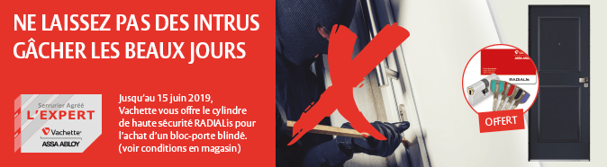 Jusqu’au 15 juin 2019, ARIANE SERVICES votre serrurier agréé l'Expert Vachette à DIVES-SUR-MER vous offre le cylindre de haute sécurité RADIALis pour l’achat d’un bloc-porte blindé Vachette.